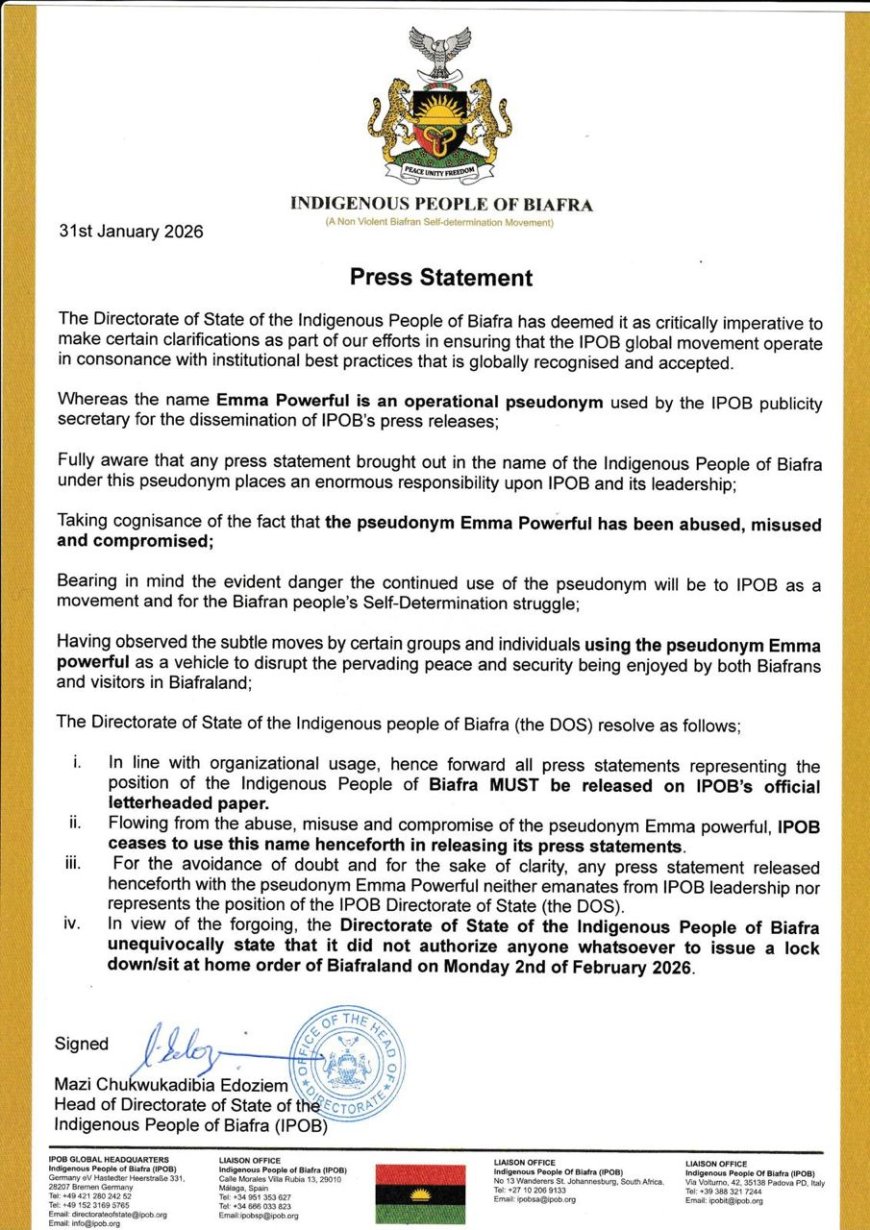 Emma Powerful announced that January 31, 2026, marked his final day of issuing any statements or press releases in any capacity connected to IPOB, warning that any publication or communication bearing his name after that date should not be attributed to him.