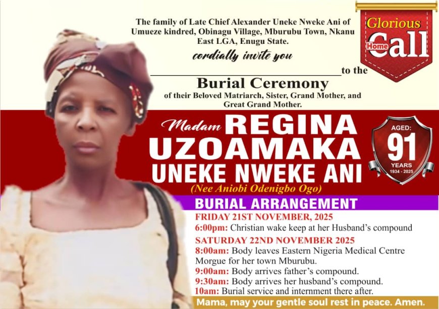 Honourable Nwachukwu's mother, Late Madam Regina Uzoamaka Uneke Nweke Ani of Umueze Kindred, Obinagu village in Mburubu town of Nkanu East LGA, Enugu State will be buried after a Christian wake keep at Nwachukwu Uneke Nweke Ani family compound Obinagu village Mburubu town on Friday 21st November 2025.