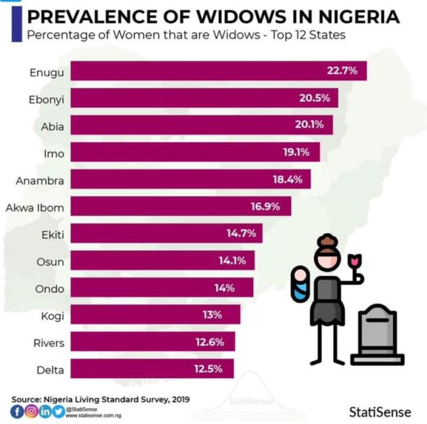 In it's indicator, Enugu State is leading the rest of the 36 states and the FCT with 22.7% widowhood, followed by Ebonyi state with 20.5%, while Abia state has 20.1%, Imo State 19.1% and Anambra, 18.4%.