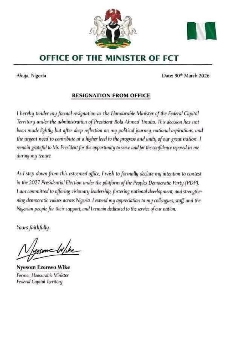 The letter which was not addressed to nobody in particular, dated March 30th 2026, suggested that Wike threw in the towel to pursue a presidential ambition in the Peoples Democratic Party (PDP).